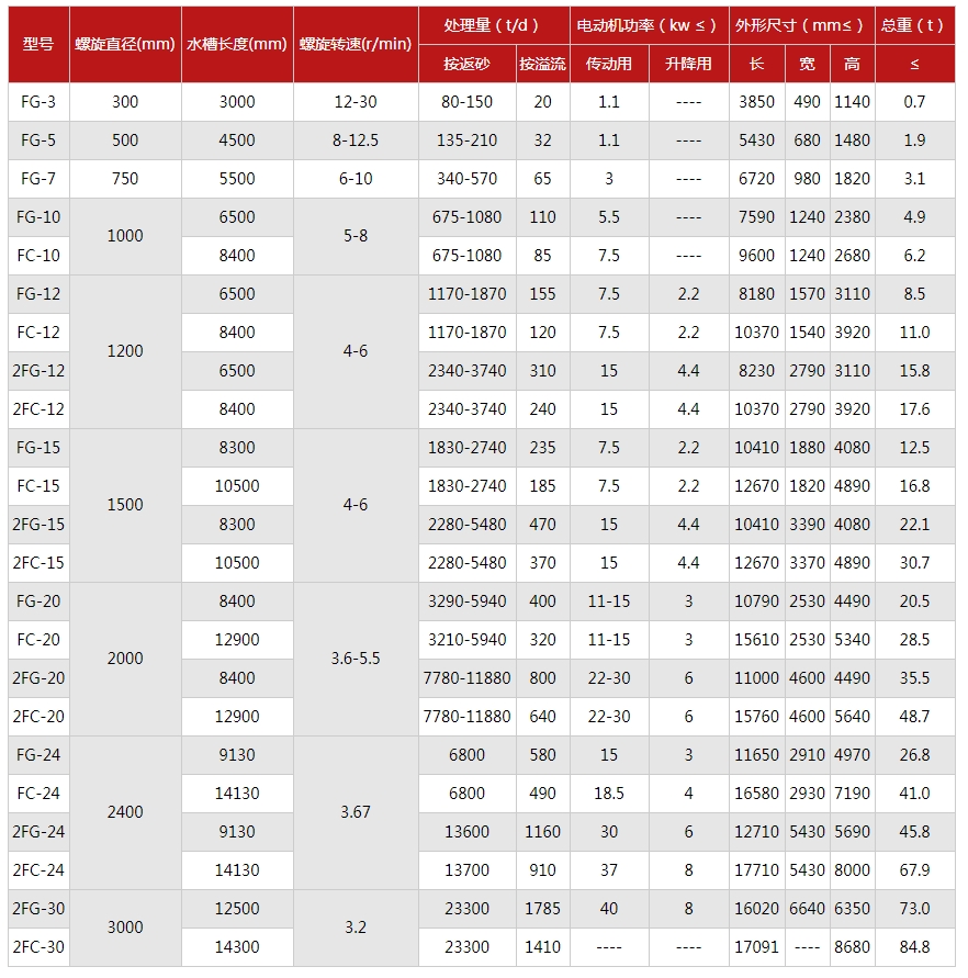 螺旋分级机适用范围:分级机主要有高堰式单螺旋和双螺旋、沉没式单螺旋和双螺旋四种分级机。